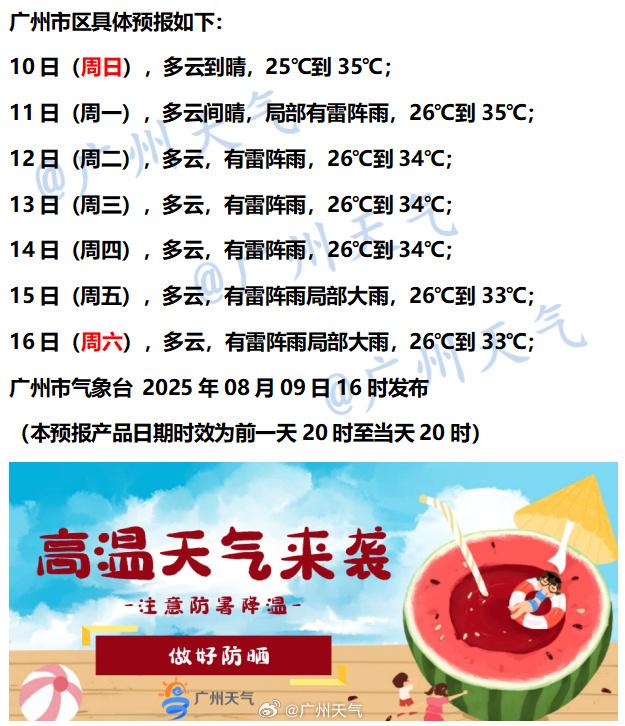 据@广东天气消息:8月10日,广东南部市县多云转(雷)阵雨,其余市县多云间晴天,午后局部有(雷)阵雨。最高气温:除雷州半岛外的南部市县31~33℃,其余市县普遍介于34~37℃。