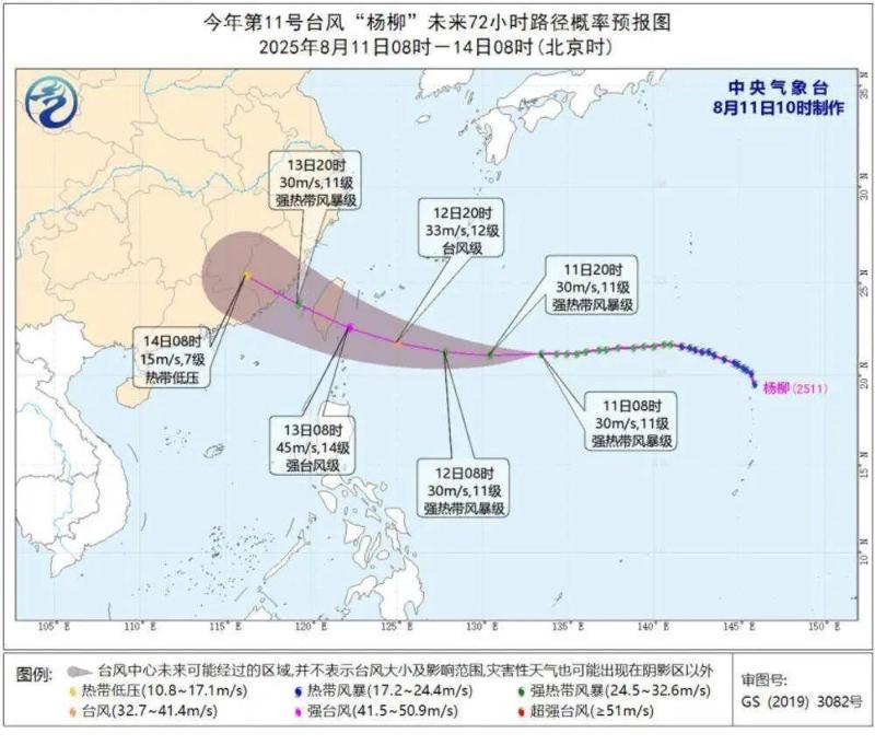 中央气象台8月11日10时发布的台风“杨柳”路径和强度预报