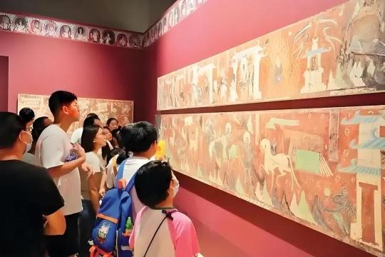 本次展览精彩纷呈,不仅复刻展出敦煌莫高窟第 285 窟、第 220 窟、第 3 窟以及藏经洞第 17 窟这四大经典洞窟,还精选 40 余幅(件)自魏晋南北朝以来的敦煌石窟及周边榆林石窟部分壁画精品、藏经洞发现的精美绢画复制品、藏经洞出土的文献复制品、彩塑复制品等,更有动态多媒体全天滚动播放关于敦煌艺术的纪录片和专题片,以及利用虚拟互动设备,让观众全方位领略敦煌千年瑰宝的独特魅力。