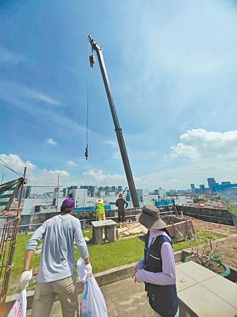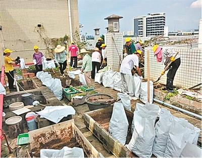 在距离丽的花园约400米的美的新邨小区,类似的场景正在同步上演。美的新邨小区是楼龄超过30年的老旧小区,楼顶公共空间被部分居民擅自占用,种菜养鸡,杂物堆积严重。顺德区、北滘镇住建部门工作人员、物业和保洁人员、热心业主一起在6栋楼顶天台干得热火朝天,挥汗如雨间,他们把一袋袋泥土、垃圾杂物装进吊斗。大吊车伸长“长臂”,从二十多米高的楼顶吊起吊斗,再运至楼下,由卡车统一运出小区。