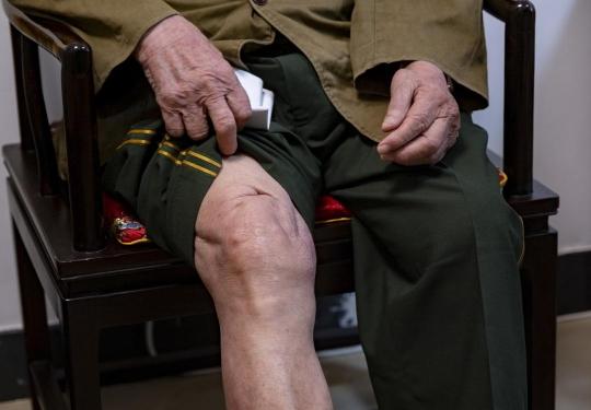 “这里的弹片一直没有取出来。”叶发撩起裤管,指了指陪伴了自己70多年的伤痕。“没什么大问题,就是刮风下雨的话会痛。比起牺牲的同志,我这是小事,微不足道。”