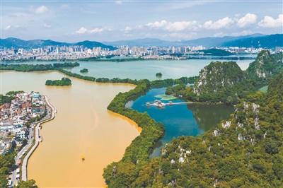 受前段时间肇庆端州区北岭山上洪水影响,近日肇庆著名景区星湖呈现出“一湖三色”的奇特景观,吸引了不少游客前来拍照观赏。