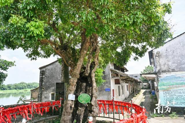 村口处,八百年的龙眼树枝干已逐渐空心,留下岁月痕迹,这棵英德市的一级古树见证着鱼咀村的更迭。树旁栏杆上挂满了红色祈愿带,承载着村民们对生活的期望。“龙眼树很久没结果了,这两年终于又开花结果,日子在变好。”廖志其说。