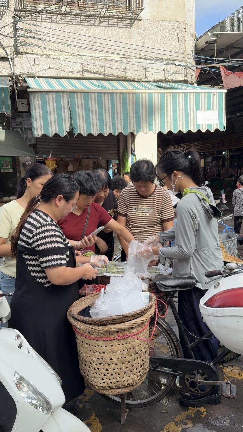 一开始,杜梓妍拍摄是以固定摊位为主。最近几个月,她听从粉丝的建议,尝试做了一点改变。参考上世纪八九十年代那种小商小贩走街串巷的风格,她也用上老式的自行车,载着老式编筐,在澄海几个不固定的地方摆摊。
