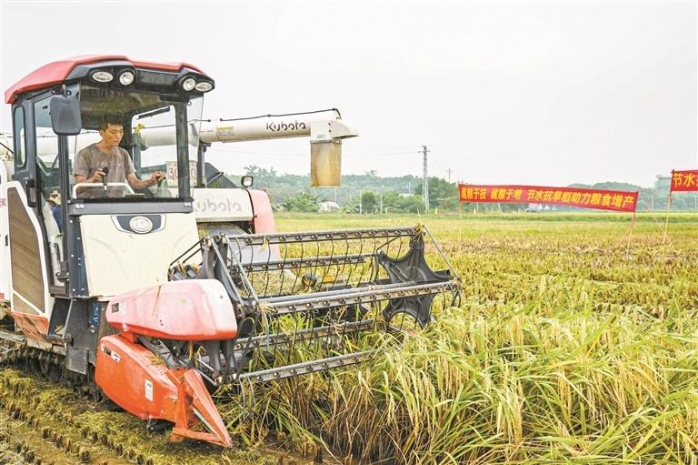 经现场测产,鼎湖区这片稻田的头季亩产达640.9公斤。收割完头茬水稻后,这一再生稻品种还可以再长一茬,实现一种收两季。“直播旱管是一种适用于节水抗旱稻的种植方式,我们的稻子不需要像传统水稻那样经历育秧、插秧,只要把种子撒在旱地里就能生长,整个生育期,田里也不会长期淹水,主要靠雨水或只在关键需水期少量补水。”罗利军说。