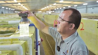养殖基地紧靠海岸,一排排人工打造的海水池内,大大小小的黄唇鱼悠然自得地游弋其间。不同生长阶段的黄唇鱼被分池管理。池边的屏幕上,温度、盐度、光照强度等数据实时更新。在这里,产学研一体化模式,实现了黄唇鱼的全人工繁育,也为野生放养,为大海保留生物多样性打下了坚实的基础。