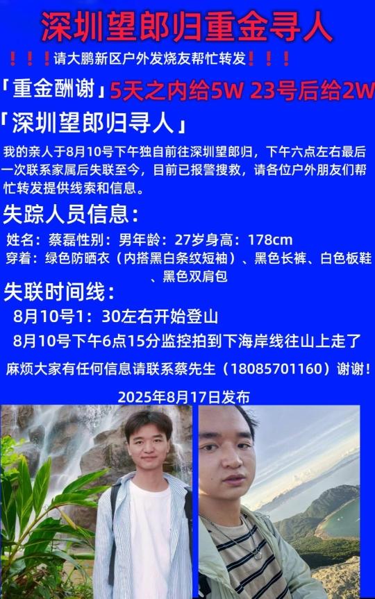 “我的亲人于8月10日前往深圳望郎归,下午六点左右最后一次联系家属后失联至今。”8月20日,27岁男子蔡磊在深圳大鹏半岛国家地质公园未开放区域登山后失联超过10天。8月17日,蔡磊的哥哥蔡先生发出悬赏:5天之内寻到人给5万元,23日后给2万元。蔡先生对记者表示,8月19日,他与父亲、两个伯父继续在蔡磊失踪地方搜寻,并未有进展。