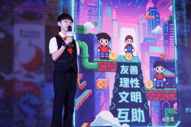 在前期开展的“活力全运 E路文明”大湾区青少年AI海报创作征集活动中,来自广东、香港、澳门及北京、天津、重庆、杭州等地的约700位青少年热情参与。香港学子用荔枝串联田园与数字世界;澳门少年让舞狮、莲花、大三巴在云端绽放;广州同学以温情代码通关美好网络世界;北京学生用一枚爱心回车键传递指尖善意……活动现场为优秀作品颁奖,获奖代表也分享了他们的创作故事与网络文明感悟,展现了当代青少年的主动而为与积极思考,以技术让文明与善意在网络空间接力传递。