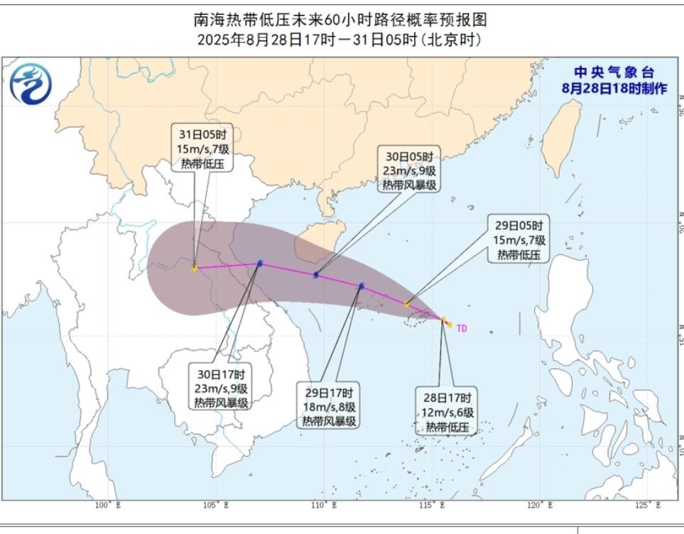 8月28日14时,南海热带扰动发展为热带低压。截至当日17时,该热带低压位于距离海南省三沙市(西沙永兴岛)东偏南方向约360公里的海上。
