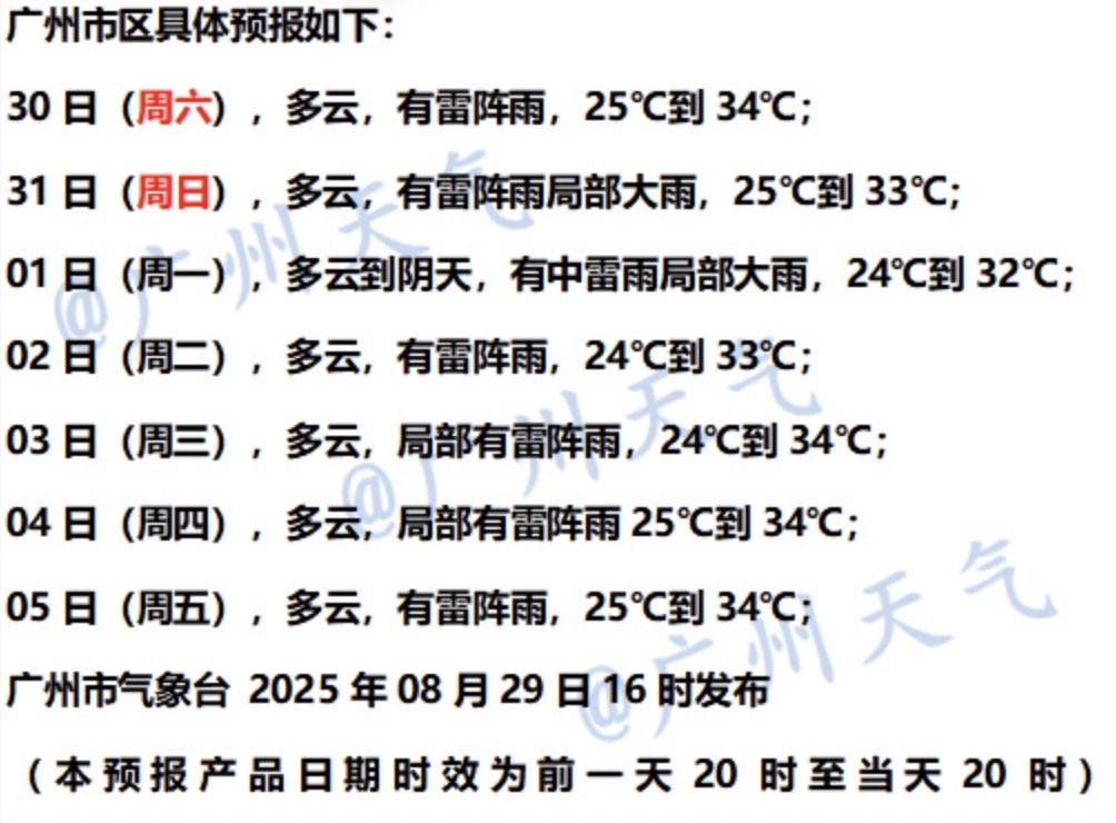 8月30日(周六),多云,有雷阵雨,25℃到34℃;