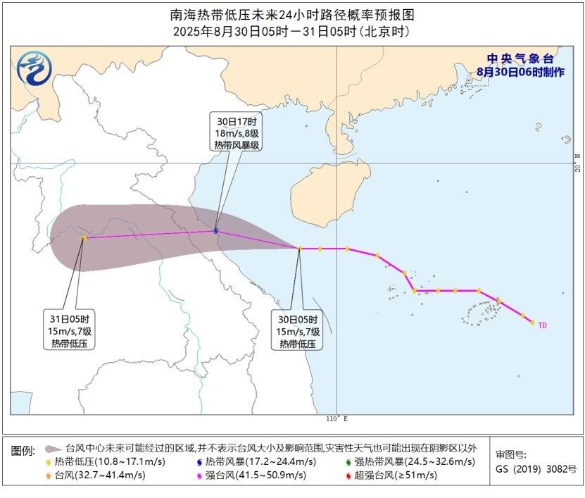 台风方面,中央气象台8月30日6时继续发布热带低压预报: