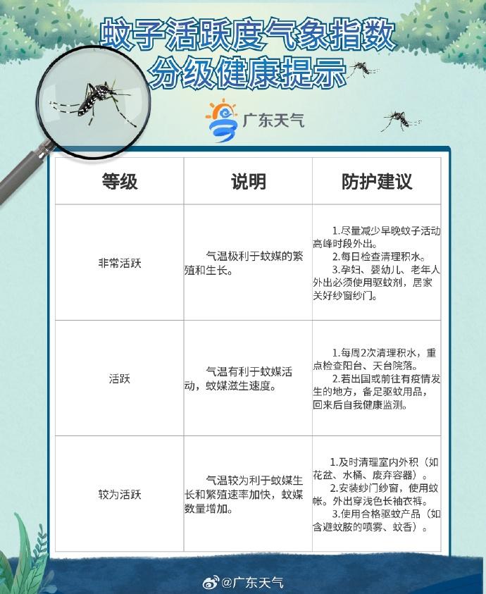 根据广东省气象局、广东省疾病预防控制局8月29日14时联合发布广东蚊子活跃度气象指数,预计未来一周(8月30日-9月5日),粤西中部、珠江三角洲中南部、粤东中部、云浮西部、梅州南部市县人口密集区蚊子非常活跃。