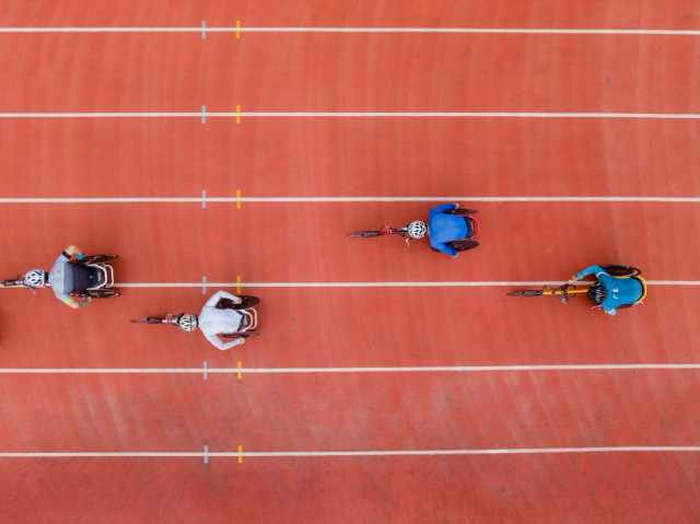 从广州市残疾人体育运动中心田径场上俯瞰,轮椅竞速队员们你追我赶。