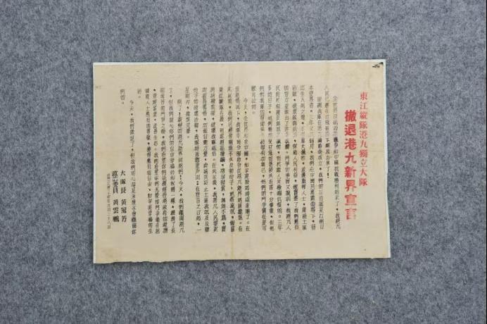 老人的话,是对父亲的告慰,更是对一段誓言的回溯:1945年9月28日,《东江纵队港九独立大队撤退港九新界宣言》(以下简称《港九大队撤退宣言》)发表。蔡建中总想象,父亲与战友们胜利撤离时,回望曾浴血守护的土地,默念宣言中“心永远不离开”的承诺,“别了!今天我们离开港九,但心永远不离开你们。希望你们光荣的斗争能引起国际人士应有的尊敬,获得应有的自由、和平与幸福的生活。”