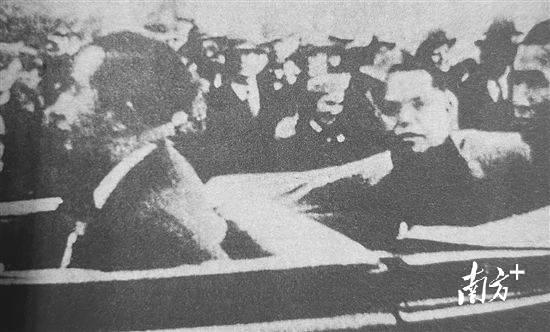 邝炳舜(右)在指挥华侨抗日游行队伍。 受访者 供图