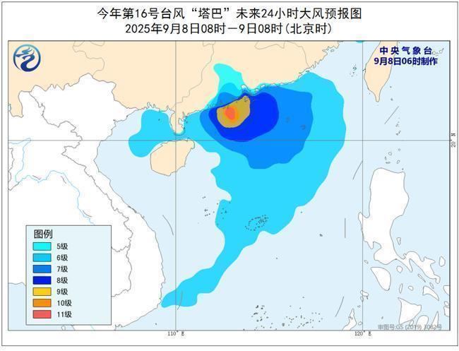 9月8日8时至9日8时,南海北部和中部、北部湾、琼州海峡、西沙群岛部分海域、中沙群岛附近海域、广东沿海、珠江口区、海南岛北部沿海、广西沿海将有6-7级大风,其中南海北部的部分海域和广东中西部沿海风力可达8-10级,台风中心经过的海域或地区风力可达11级,阵风12-13级。