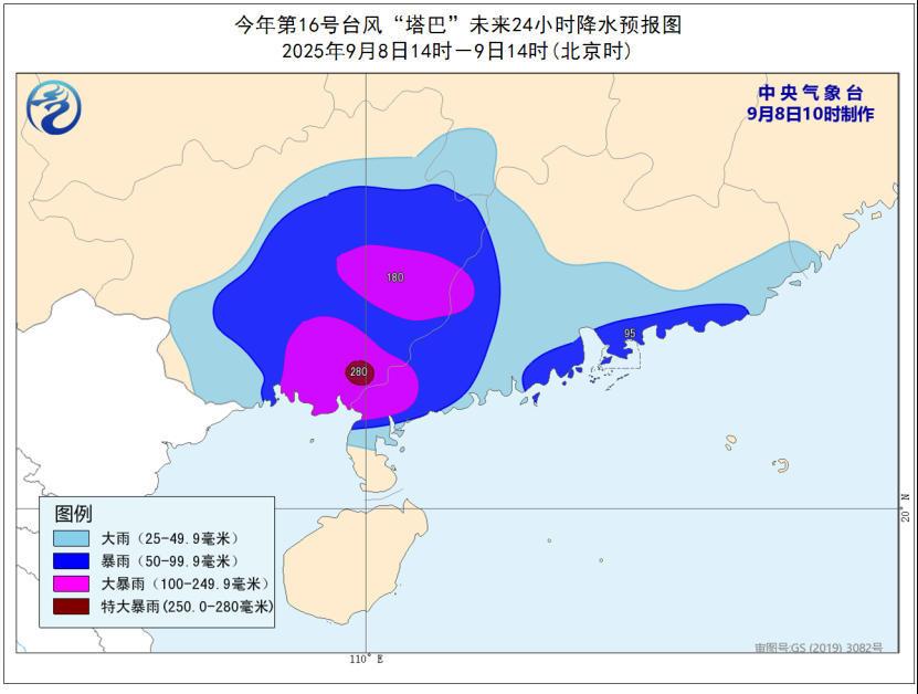 据中央气象台预计,今明两天,台风“塔巴”将给广东、广西等地及南海海域带来强风雨天气。其中,南海海域今日仍有大风,预计明日风力减弱,广东今天进入最强降雨时段,广西降雨最强时段将出现在9日,公众需要及时做好防范措施。