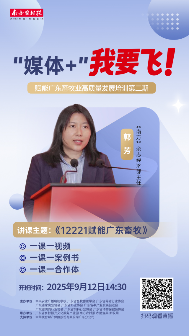 “12221”市场体系如何精准落地畜牧产业?《南方》杂志经济部主任郭芳将作《12221赋能广东畜牧》主题分享,主题聚焦“12221”市场体系在畜牧产业的落地与实战打法。