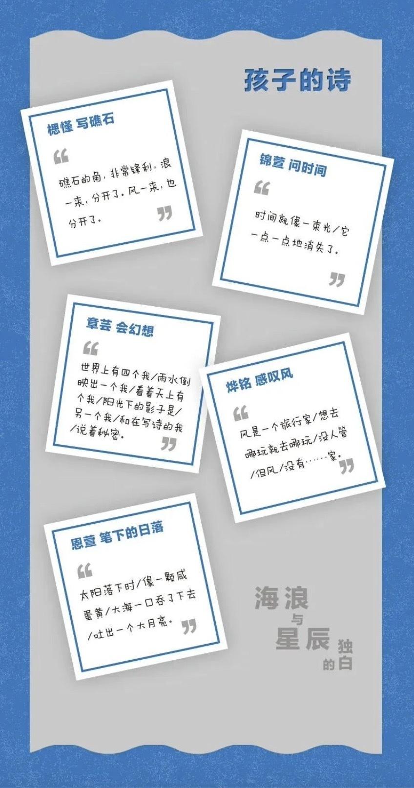 渐渐地,写诗已经变成了孩子们的一种习惯。周其星惊喜地发现,孩子们甚至在课后托管班时询问老师是否可以写诗。很快,孩子们便展现出惊人的创造力——他们用“诗人之眼”重新打量身边的世界:壮丽的日落、切分海浪的礁石、染白歌声的浓雾、吹得人寸步难行的风……周其星特别珍视孩子们这份天性,他反对老师对孩子诗歌的过度修改:“自然虔诚甚至笨拙幼稚,这才是最难达到的。”