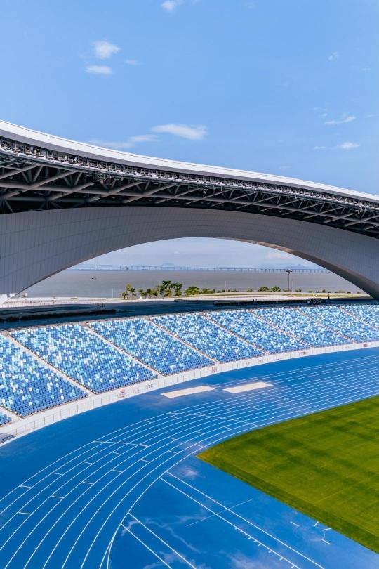 通过大湾区文化体育中心综合体育场的大拱,观众可以“边看比赛边看海”。邱活摄
