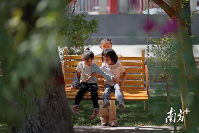 课间,小女儿潘懿珩正和维吾尔族同学们一起玩荡秋千。