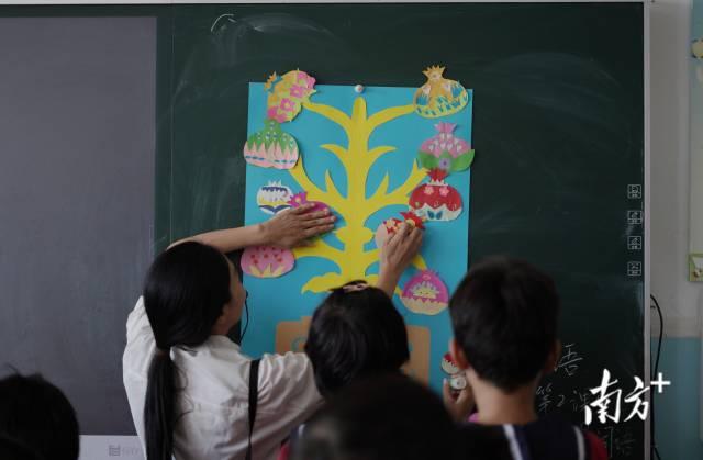 陆婉静正领着孩子们将剪纸作品“石榴树”贴在黑板上。