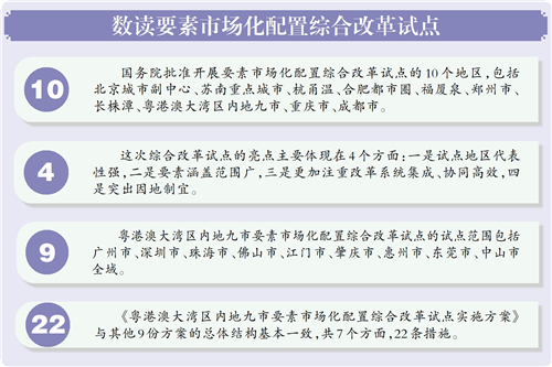记者留意到,10个试点地区中,就有5个为跨市域的城市群、都市圈。其中,粤港澳大湾区内地九市是涉及城市最多的试点地区。围绕全面提高要素协同配置效率,《粤港澳大湾区内地九市要素市场化配置综合改革试点实施方案》部署了推动人力资源市场、技术市场、政务服务一体化等具体措施。