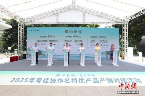 “山水联动·粤见桂林”2025年粤桂协作名特优产品产销对接活动13日在位于广州的广东区域协作消费帮扶产品交易中心举行,共有6个产销项目达成战略合作,来自粤桂的多家企业、商协会现场进行签约,涉及果品、粮油等多个领域。