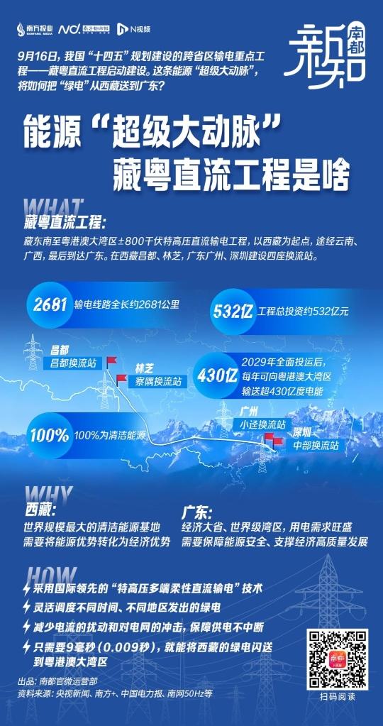9月16日,我国“十四五”规划建设的跨省区输电重点工程——藏粤直流工程启动建设。这条能源“超级大动脉”,将如何把“绿电”从西藏送到广东?