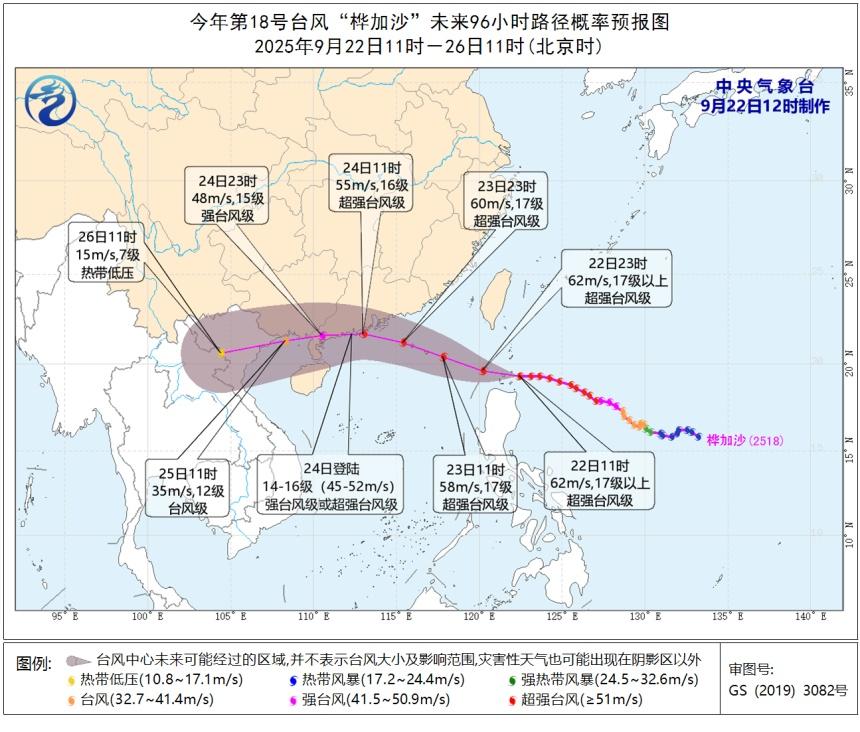 9月22日11时,今年第18号台风“桦加沙”中心位于北纬19.3度、东经122.4度,距离东沙岛东偏南方向约590公里,中心附近最大风力17级以上(62米/秒),中心最低气压910百帕。