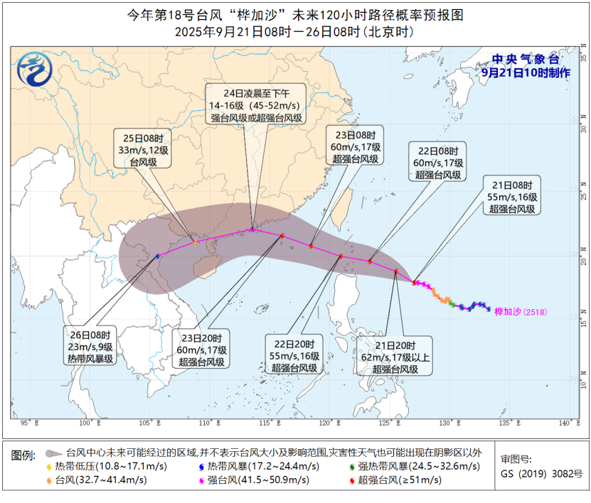 台风“桦加沙”可谓来势凶猛。9月20日夜间,其加强为强台风级;9月21日上午,加强为超级台风级,成为今年西北太平洋最强台风。9月22日上午,据中央气象台发布的台风黄色预警,其中心最大风力达17级以上,移速快、强度强,巅峰强度将接近2024年第11号台风“摩羯”。同时,预计“桦加沙”登陆华南的强度也将达强台风级或超强台风级,南海北部和华南等地致灾风险极高。