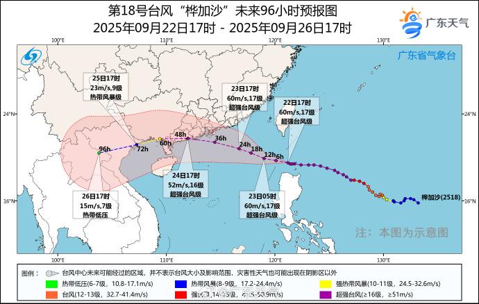 中央气象台预计,“桦加沙”将于24日上午到晚上在广东惠州到海南文昌一带沿海登陆(强台风级或超强台风级,14-16级,45-52米/秒)。