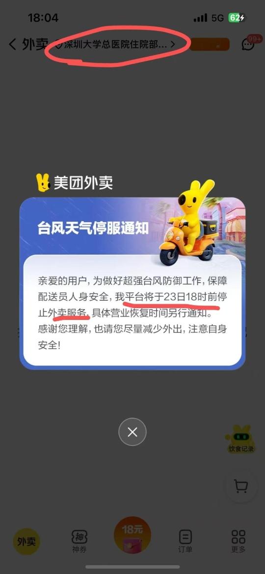 9月23日17:30,记者发现,珠海、东莞等地的美团外卖、京东外卖、朴朴超市等多个平台已停止派单服务,界面显示“暂时无法提供配送服务”;18:00,深圳地区外卖平台亦显示停止服务。截至发稿,广州的外卖平台还可以提供服务,并提醒“为保障骑手生命安全,平台也会延长配送时间,并根据天气情况随时可能暂停外卖服务”。