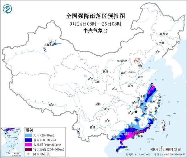 预计,9月24日08时至25日08时,广东大部、广西东部和南部、福建东部和南部、海南岛北部和西部、台湾岛东部、江苏中部、安徽中南部、湖北东部、江西北部、东部和西南部、浙江东部以及新疆沿天山一带东部、云南西南部等地部分地区有大到暴雨,其中,广东中南部、福建东南部、海南岛西部、台湾岛东南部、江苏中部、安徽中部等地部分地区有大暴雨,广东东南部沿海和西部等地局地特大暴雨(250~270毫米)。上述部分地区伴有短时强降水(最大小时降雨量20~50毫米,局地可超过70毫米),局地有雷暴大风等强对流天气。