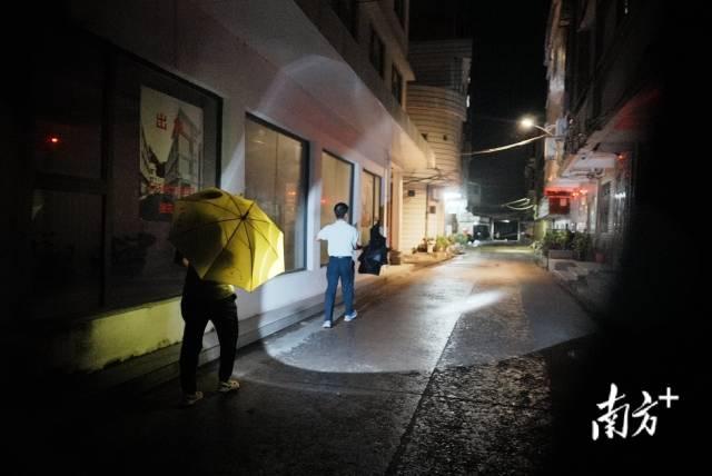 风雨中,社区工作人员拿着手电筒,前往被转移群众家中核查。