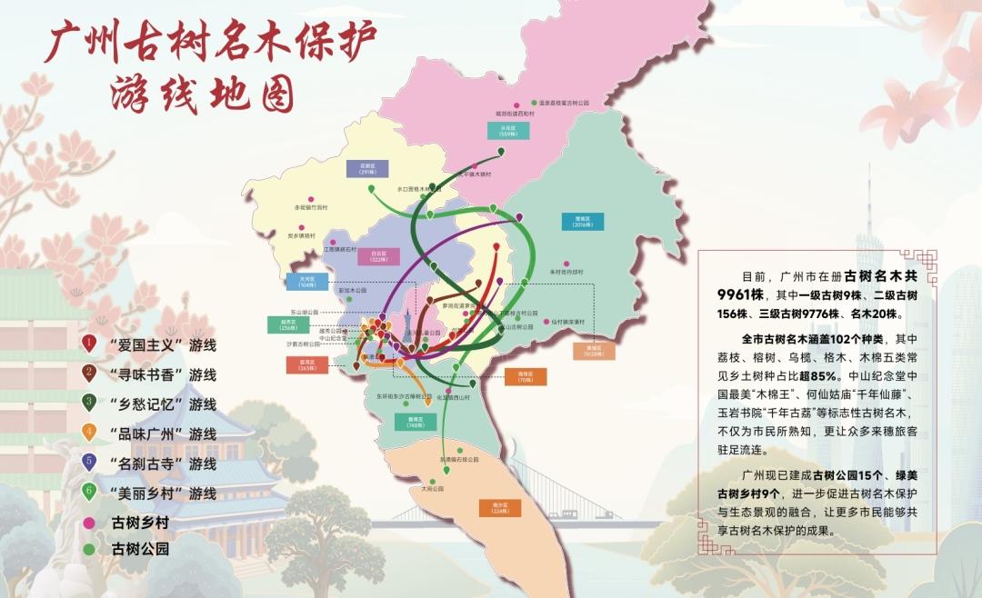 活动现场还发布了广州市古树名木保护游线路,6条游线分别以“爱国主义教育”“品味广州”“美丽乡村”“乡愁记忆”“寻味书香”“名刹古寺”为主题,串联起越秀、荔湾、海珠、天河等多个区域的代表性古树名木与人文地标,为广大市民和游客提供更多亲近自然、品味岭南文化、感受“古树名城”魅力的打卡地,成为绿美广东生态建设的一个重要缩影。