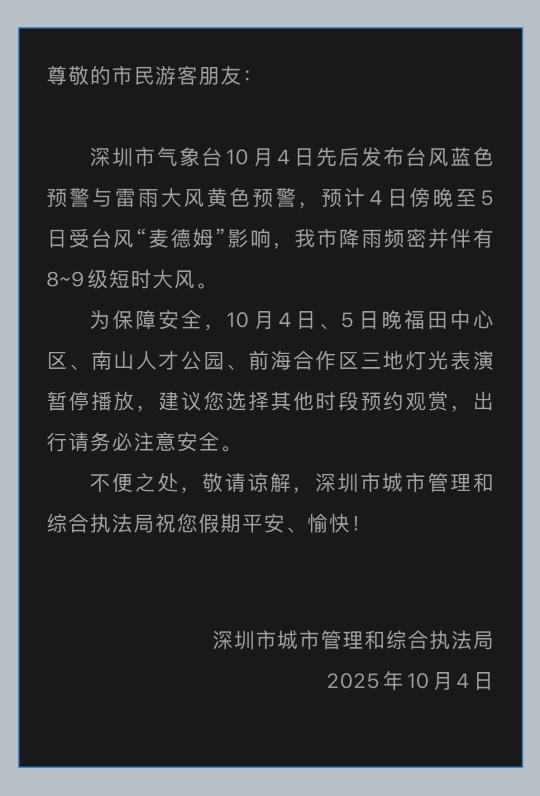 为保障安全,深圳城管提醒,10月4日、5日晚福田中心区、南山人才公园、前海灯光表演暂停播放,建议观众朋友选择其他时段预约观赏,出行请务必注意安全。不便之处,敬请谅解!