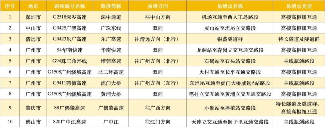 繁忙高速公路路段共10处