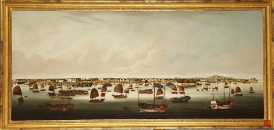 约1845年 疑煜呱绘“广州港全景图”油画