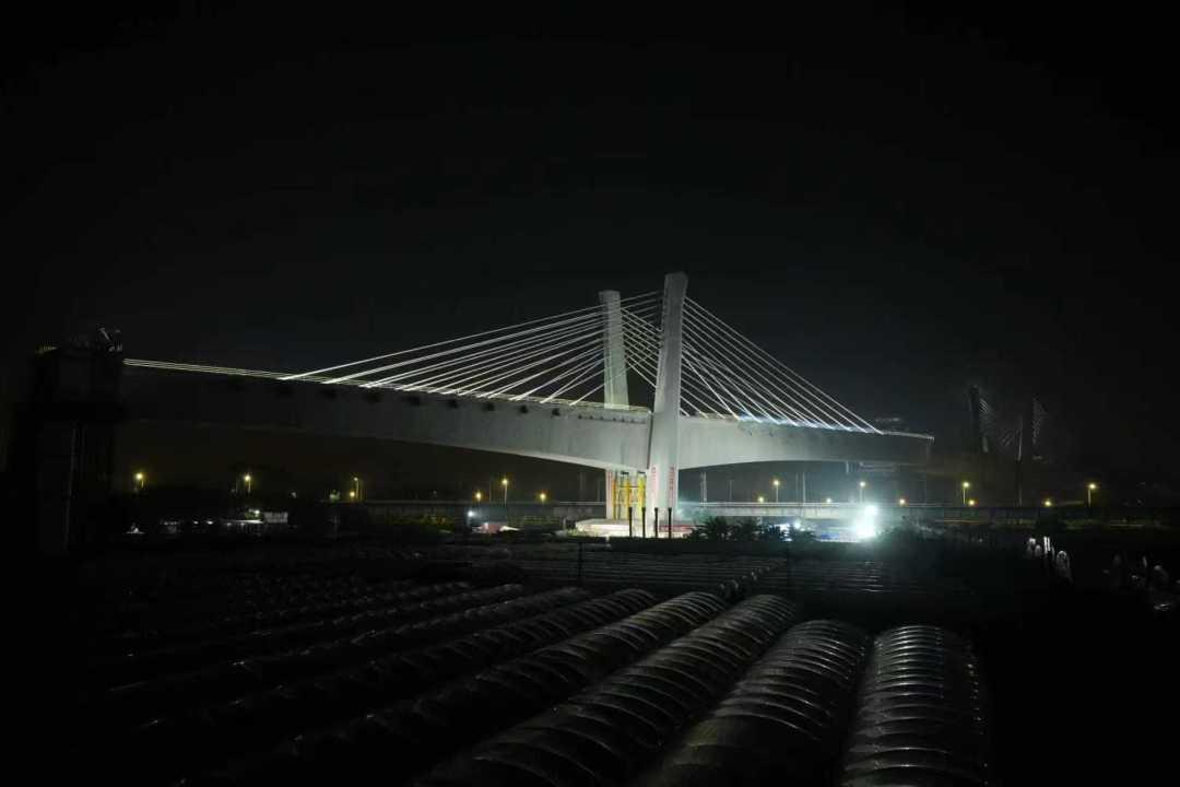 10月16日凌晨,随着两台液压连续张拉千斤顶持续精准牵引发力,由广州地铁集团负责建设管理、中铁广投总承包管理、中铁广州工程局承建的珠三角城际轨道交通广佛环线佛山西站至广州北站段工程(广佛西环城际)全线唯一转体桥——官窑西南涌特大桥(124+230+124)米斜拉桥犹如空中“芭蕾舞者”平稳旋转,顺利转体跨越广珠铁路、广佛肇高速公路等重要建构筑物,实现毫米级精准对接。这标志着项目控制性节点取得重大突破,为全线桥梁贯通奠定了坚实基础。