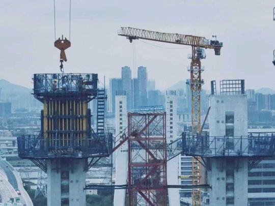 据中铁广州工程局集团现场技术负责人介绍,施工过程中,项目部始终坚持“数智赋能、安全至上”的理念,结合大桥建设实际,编制专项施工组织设计,制定科学合理的施工方案,运用 Midas、Ansys等有限元软件,对栈桥、水上平台、钢围堰、现浇钢管支架、挂篮开展设计验算,克服了高压线下大直径钻孔灌注桩施工、大型双壁钢围堰精准下放、异型索塔爬模施工等多项技术难题。同时,主塔施工配置智能爬升、智能喷雾养护和智能监测三大系统,实现了同步智能爬升、混凝土智能喷雾养护及智能造塔平台受力、变形和施工环境、温度的自动监测,为主塔顺利封顶提供了坚实保障。