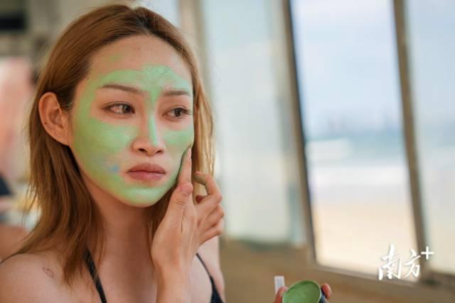 一位女性在冲浪前涂抹对海洋生物友好的防晒泥。