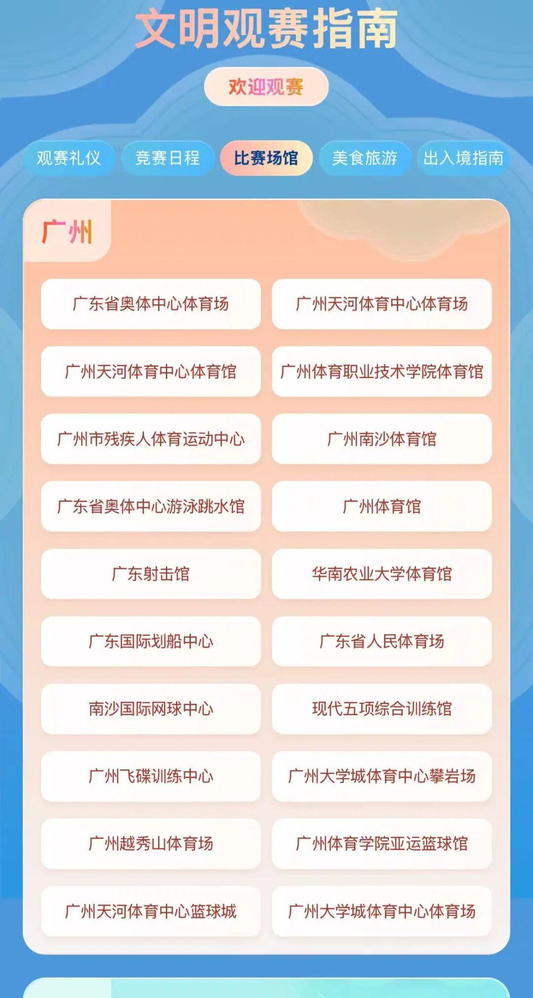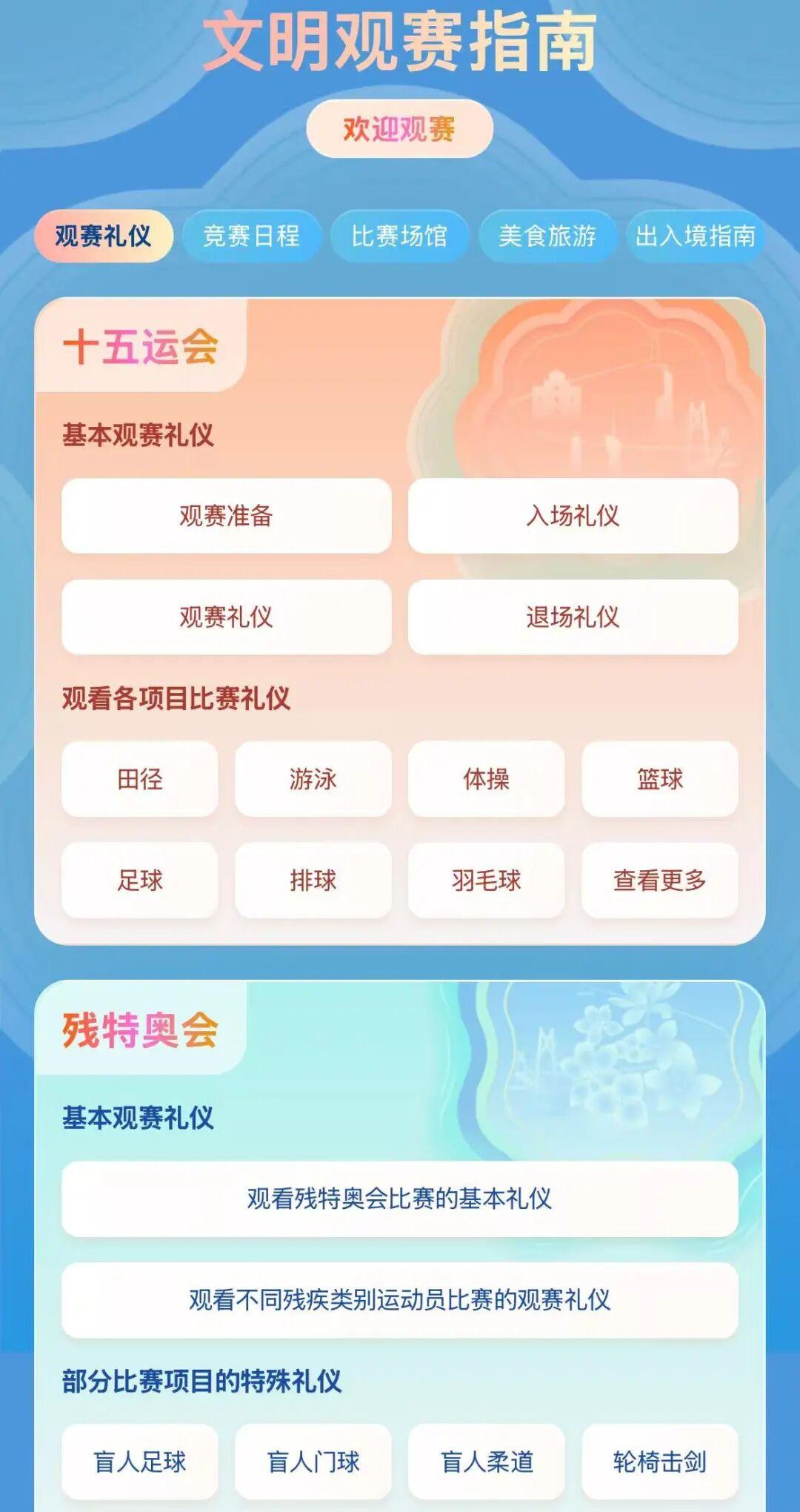 “观赛礼仪”板块带你解锁各个项目的文明观赛礼仪及正确助威姿势,并贴心附上跳转链接,一键直达赛事日程和场馆详情,再也不怕错过精彩瞬间!