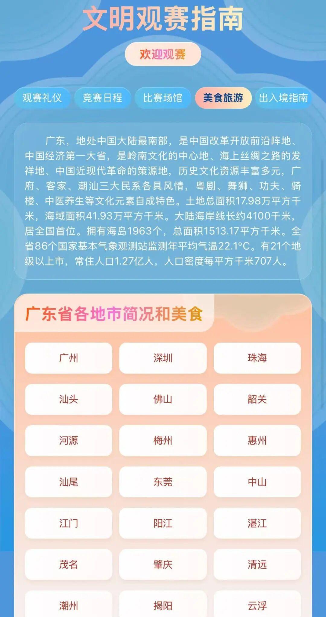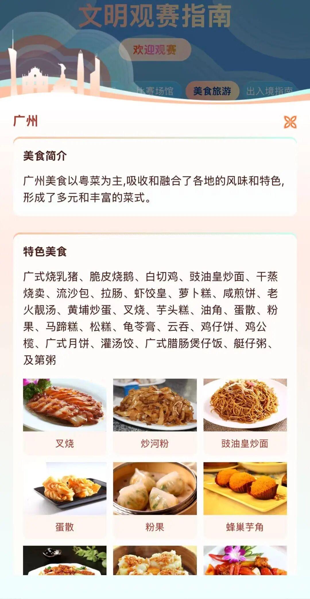广东省5A景区、地市风貌、特色美食、主题精品旅游线路推荐……“美食旅游”统统收录!无论是老广经典早茶,还是城市网红打卡点,一屏尽在掌握,带你在看完比赛后继续深度畅游大湾区。