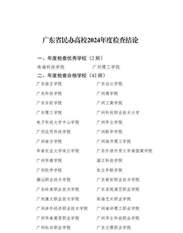 10月27日,广东省教育厅公示我省民办高校2024年度检查结论。据公示,我省50所民办本、专科院校中,2所优秀,42所合格,6所基本合格。