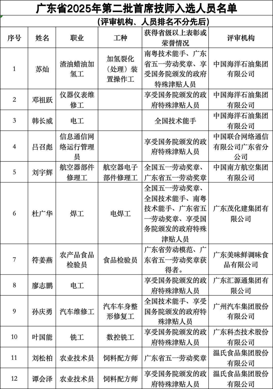 10月27日,广东省人力资源和社会保障厅在其官方网站发布《关于广东省2025年第二批首席技师入选人员名单的公示》,按照《关于开展广东省2025年特级技师、首席技师评聘工作的通知》要求,经企业自主制定评聘工作方案和组织评审、地市初审和推荐、省组织专家进行复核后,拟确定苏灿等12名同志为广东省2025年第二批首席技师入选人员,现将名单(附件)予以公示。