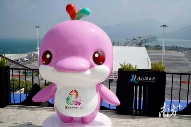 港珠澳大桥的蓝海豚岛观景台上已放置了十五运会吉祥物。