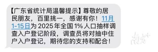 2025年全国1%人口抽样调查入户登记工作于11月1日正式启动。近日,不少市民收到短信误以为是被抽中调查。广东省统计局对此进行了澄清。