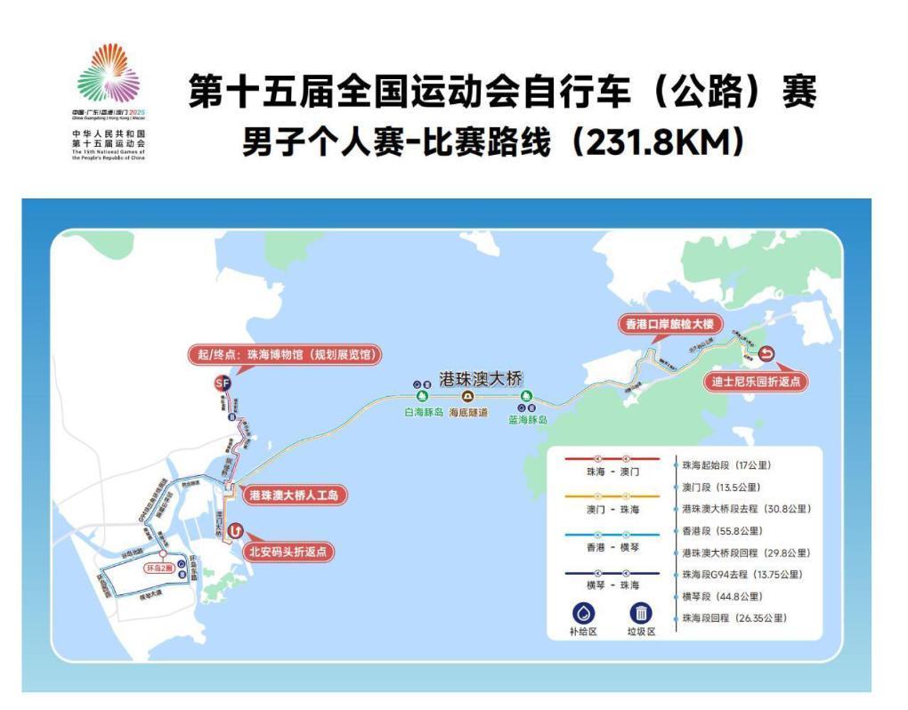 男子个人赛全程231.8公里,串联香港、珠海、澳门及横琴粤澳深度合作区,是全运会历史上首次跨越粤港澳三地的比赛项目。