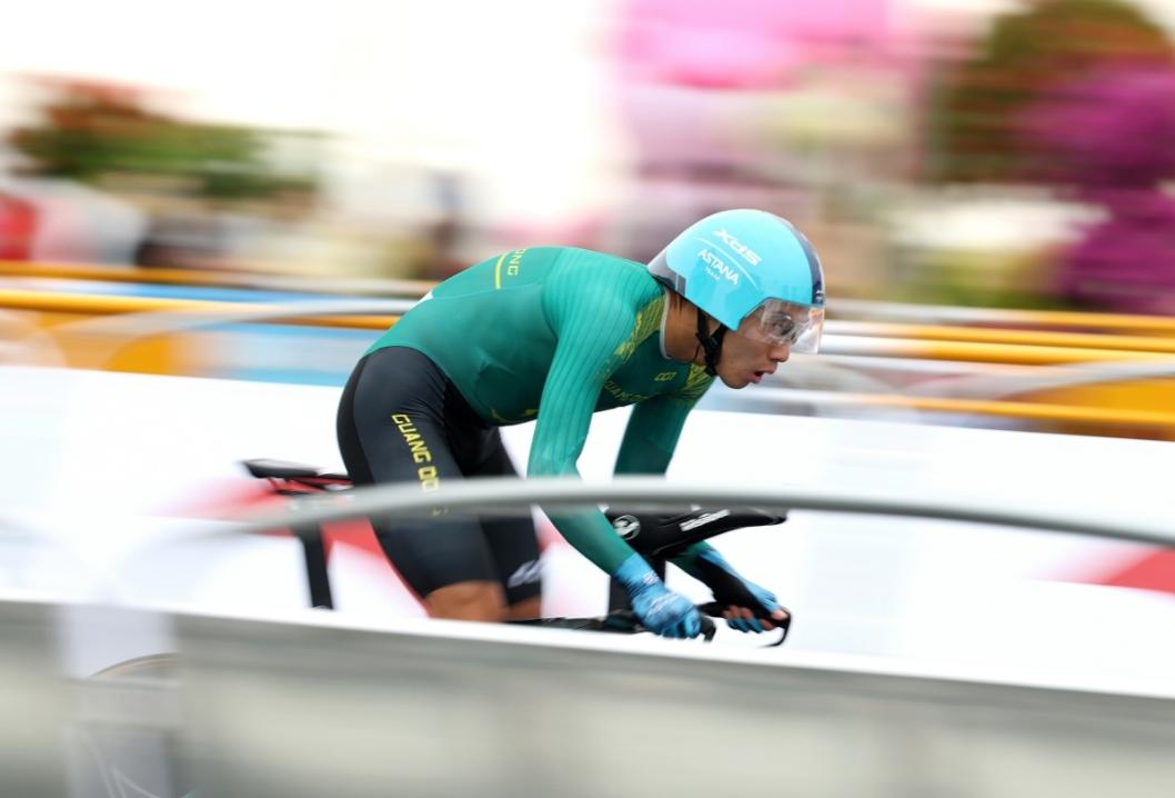 11月7日,广东队选手苏浩钰在十五运公路自行车男子个人计时赛的比赛中。(新华社发)
